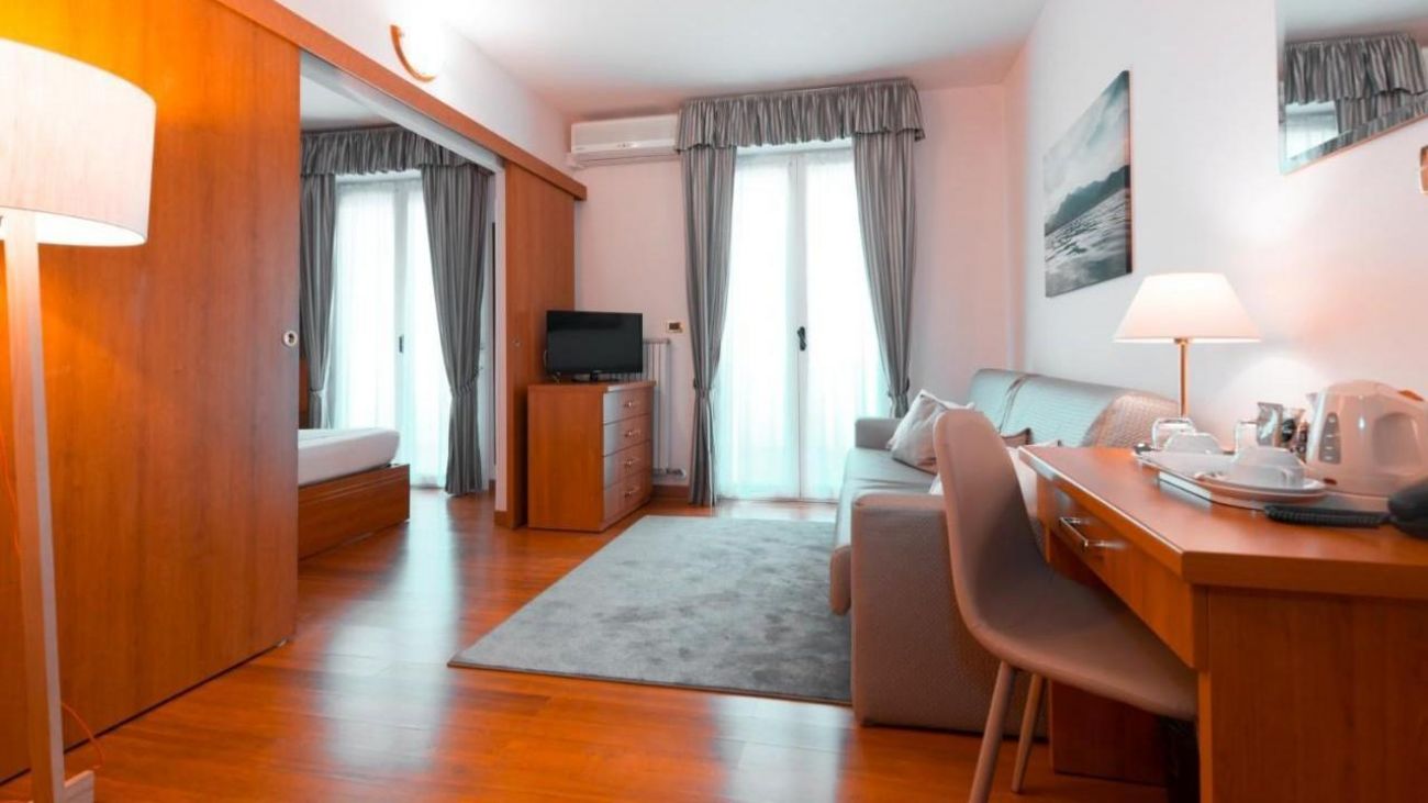Classic room – 32 кв.м. Подходящ е за семейства от 2 до 4 души. Класическата стая се състои от две стаи, разделени с голяма плъзгаща се врата: двойна спалня с двоен гардероб, всекидневна с разтегателен диван и две единични разтегателни легла.