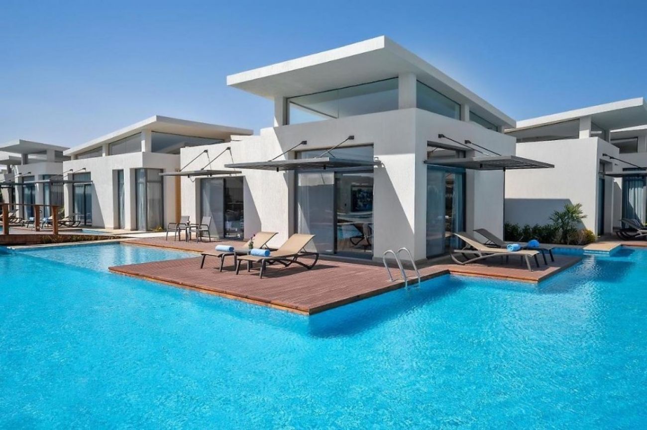 Pool Villa with Twin beds – 129 m2, Вила с басейн предлагаща луксозно настаняване с елегантна и големя дневна с трапезария,спалня с двойно легло King Size и две единични легла, машина за еспресо, сейф, LCD телевизор, тераса с директен достъп до общ басейн, изглед към морето, басейна или градина.