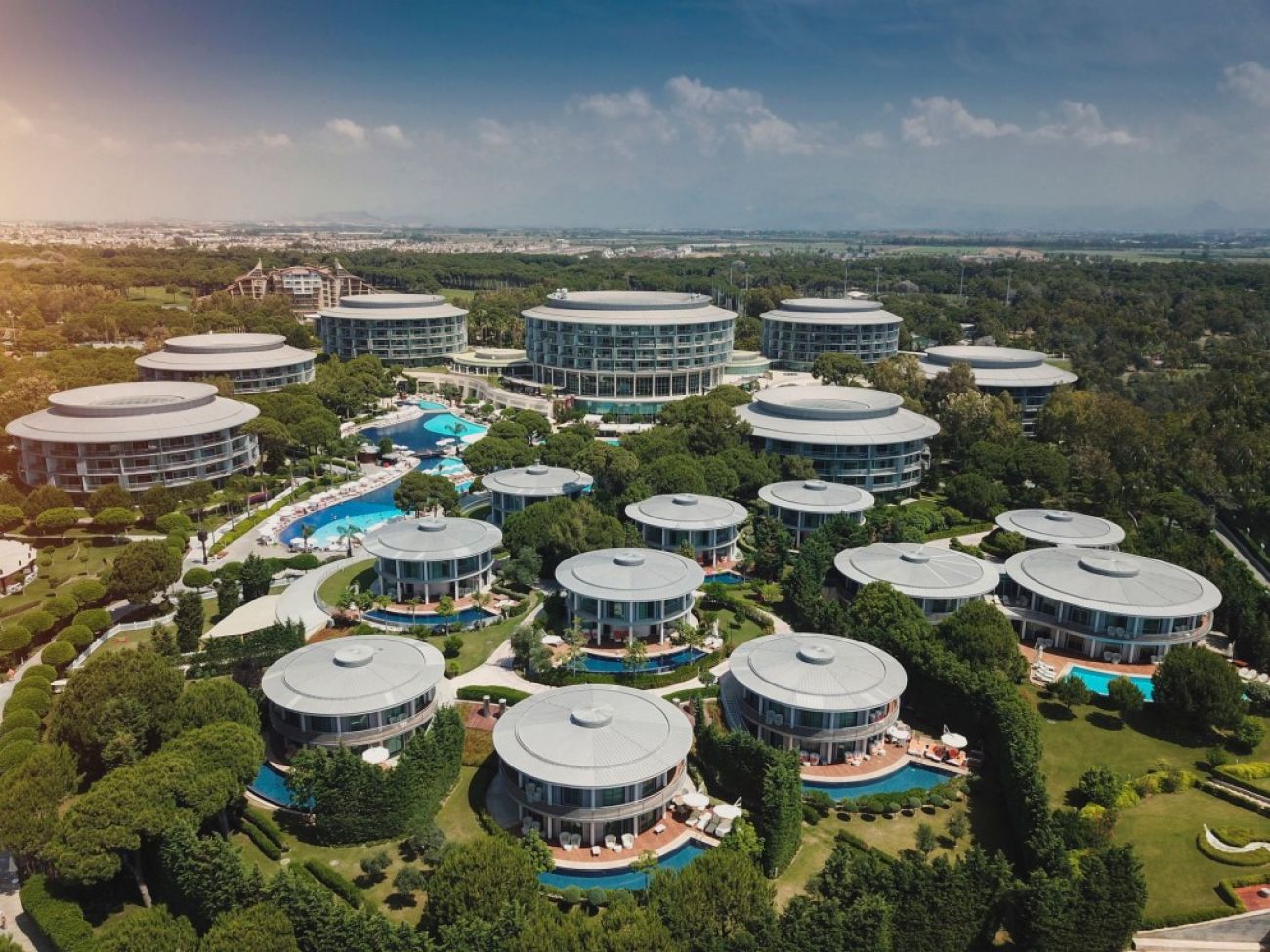 В стаите: Състои се от седем 4-и 5-етажни корпуса и четиринадесет 2-етажни вили и разполага с общо 600 стаи с изглед към градината. Стаите са оборудвани с централна климатизация, мини-бар (безалкохолни напитки, бира, ядки, вафли, чипс - ежедневно зареждане, безплатно), интерактивна телевизия, LCD32 телевизор, сейф (безплатно), телефон с директно избиране, Wi-Fi (безплатно), баня душ и вана, сешоар, дъска за гладене и ютия, халати за баня и чехли, балкон, сет за кафе и чай, ябълки и вино (в деня на пристигане). Почистване на стаите - ежедневно, смяна на спално бельо - ежедневно.