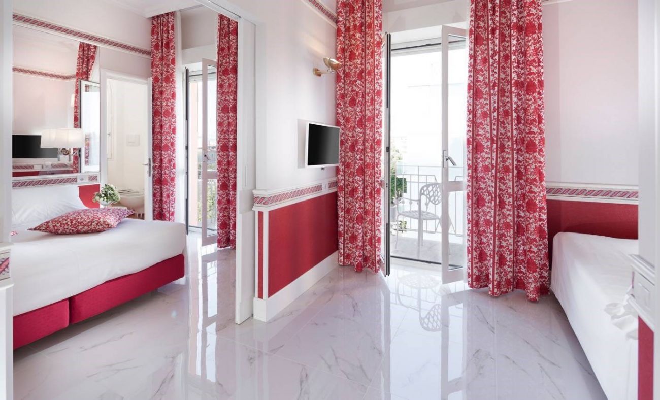 Семеен стая: 3 - 4 души. 25,00 м2. 2 стаи: 1-ва стая с кралско легло, 2-ра стая с единично легло или двуетажно легло, изглед към морето или към градината, DVD плейър, халат и чехли.