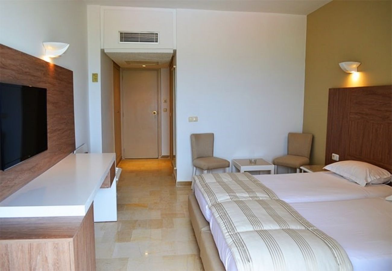 В стаите: Хотелът разполага с общо 330 стаи, разположени в четириетжна сграда с 2 асансьора - Standard Room (24-26 кв.м), Sea View Room (24-26 кв.м), Family Room (26-28 кв.м с една спалня), Superior Family Room (36-38 кв.м с две спални, отделени с врата). Всички стаи са оборудвани с климатик, телевизор, мини бар (ботилирана вода в деня на настаняване), баня с душ/вана, сешоар, сейф, балкон/тераса. Почистване на стаите - всеки ден.
