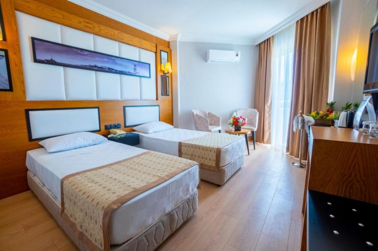Плаж: Собствен пясъчно-чакълест плаж, до който се стига посредством подлез под главния път (свързващ Анталия и Алания). На плажа и басейна - чадъри, шезлонти, матраци и плажни хавлии - безплатно. Бар на плажа - безплатно.