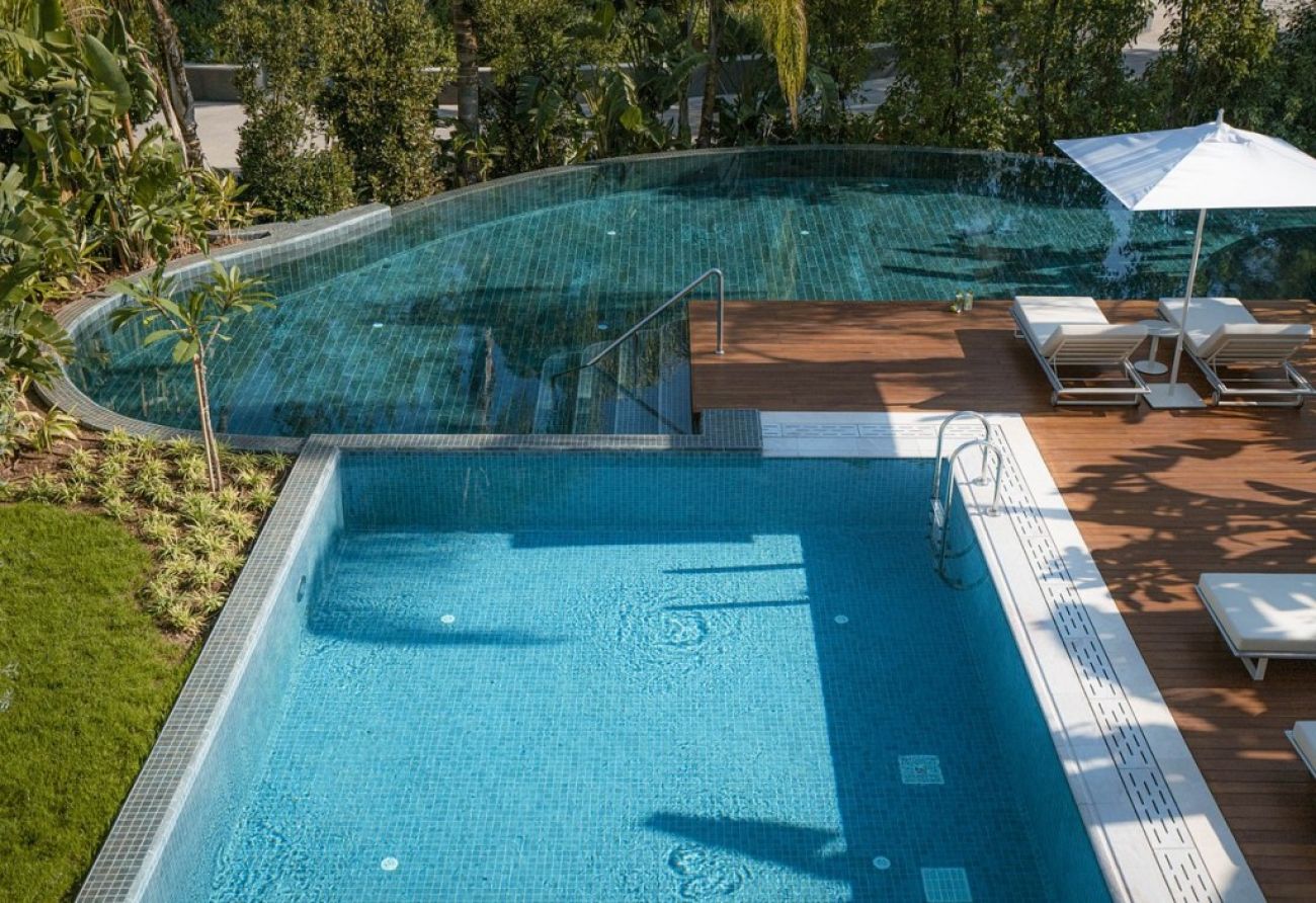 Bayou Villa 2 Bedrooms - С площ от 502 м2, вила с 2 спални има 3 етажа, и състои се от вътрешна част от 314 м2 с хол, спалня, баня, тоалетна и кухня на първия етаж и родителска спалня, баня, тоалетна, съблекалня и тераса на горния етаж. Частната градина с площ от 188 м2 включва отопляем частен басейн от 20 м2 с морска вода, тераса с шезлонг, трапезна маса и градински мебели, както и място за слънчеви бани и почивка. Отваря се и към басейна лагуна с прясна вода. Има частна фитнес зала (велосипед, бягаща пътека, уреди за тежести), билярдна маса, сауна, турска баня/парна баня, джакузи, стая за масаж с 2 легла, 55" телевизор, минибар и градина в сутерена на вилата.