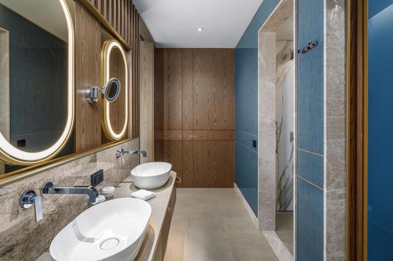 Bayou Villa 4 Bedrooms - С площ от 983 м2, вила с 4 спални, на 3 етажа и се състои от закрита площ от 579 м2 с всекидневна, спалня, съблекалня, баня, тоалетна, кухня и асансьор на първия етаж, а на горния етаж 3 спални, 3 бани, съблекалня и работно помещение. Частната градина с площ от 404 м2 разполага с отопляем частен басейн от 51 м2 с морска вода, тераса с шезлонг, маса за хранене и градински мебели, както и място за слънчеви бани и почивка. Отваря се и към басейна лагуна с прясна вода. Във всекидневната на вилата има пиано. Вилата разполага също и с билярдна маса, турска баня/парна баня, сауна, джакузи, стая за масаж с 2 легла, фитнес, 55” телевизор, минибар и градина в сутерена на вилата, която улавя слънчевите лъчи.