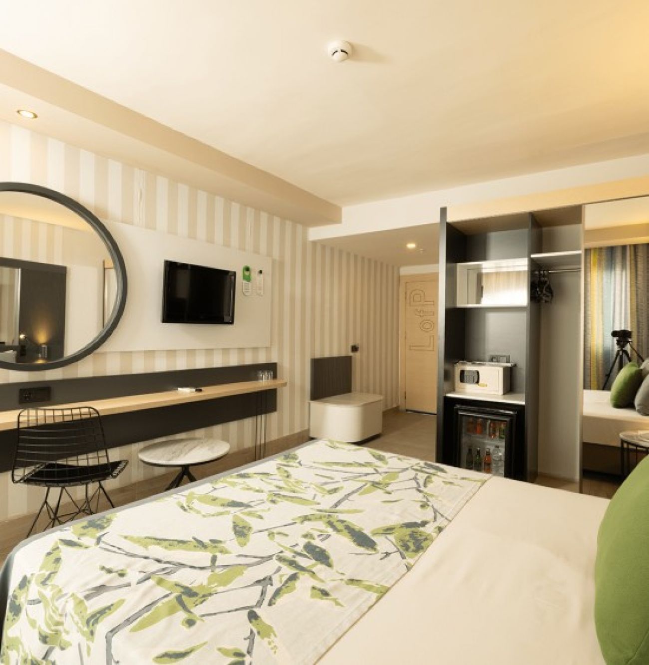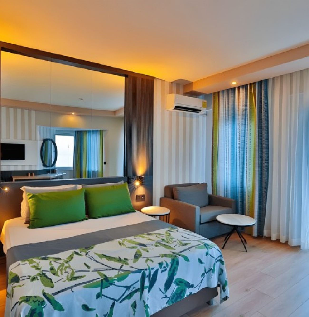 Стаи: EOS Beach Resort предлага 262 стаи. Всички стаи разполагат с централно отопление и охлаждане, телефон, баня с душ, сешоар, телефон в банята, луксозни тоалетни принадлежности, минибар ( Включва кола, фанта, вода, сода и сок при пристигане. Водата се допълва ежедневно), сателитна телевизия, безжичен интернет, ключ карта за достъп и система за сигурност, електронен сейф, самостоятелни балкони (повечето с изглед към морето).