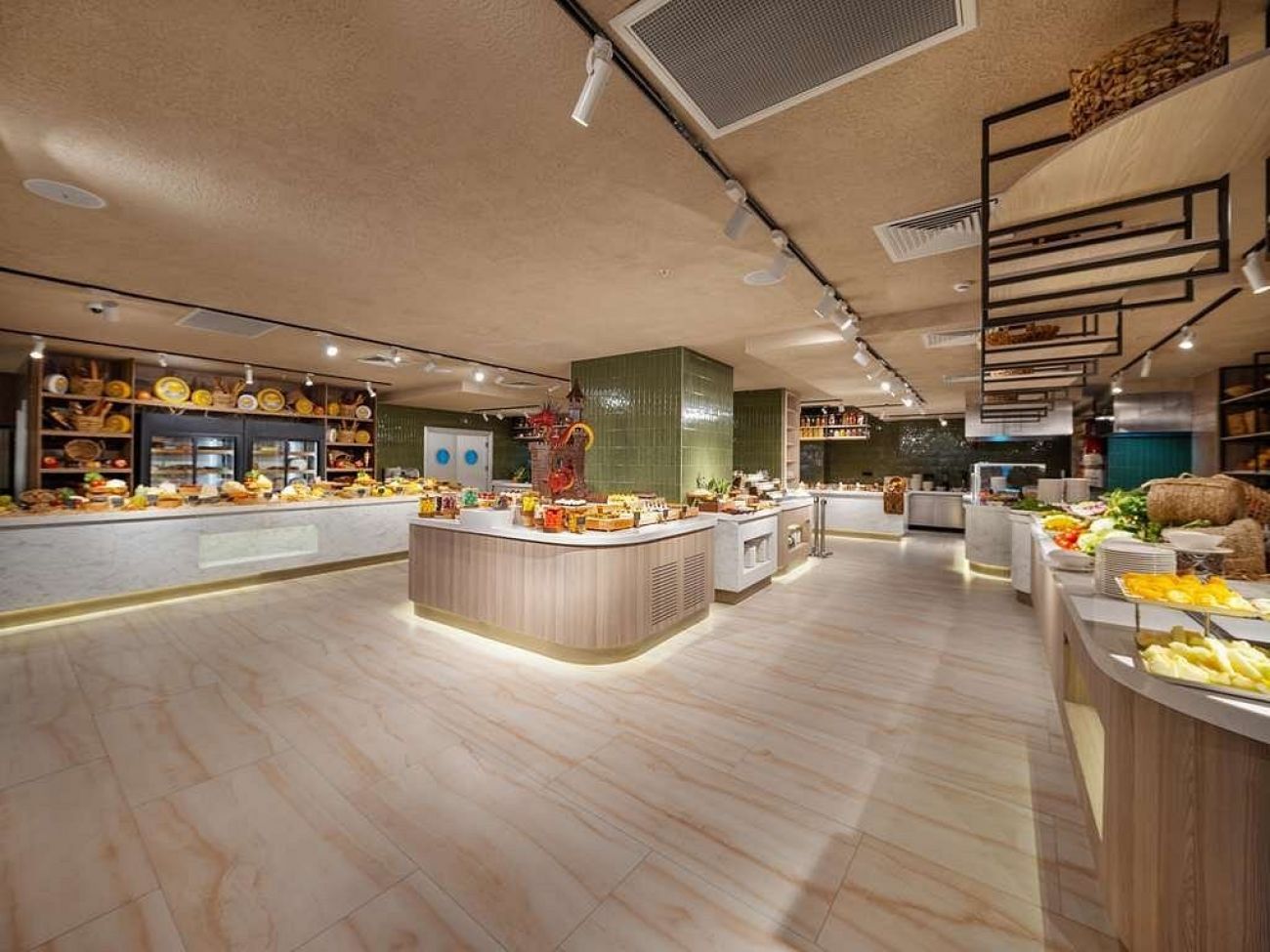 Основен ресторант, 2 а-ла-карт ресторанта (интернационален/морски ресторант – 1 безплатно посещение на 1 от ресторантите при минимум 7 нощувки, с предварителна резервация; италиански/стек ресторант – срещу заплащане, с предварителна резервация), 2 снек бара (на плажа и на терасата до басейна), сладкарница, 6 бара, 4 открити басейна (2, от които отопляеми) и 1 закрит басейн (отопляем), аквапарк с 5 водни пързалки за възрастни и 5 за деца, СПА център, магазини.