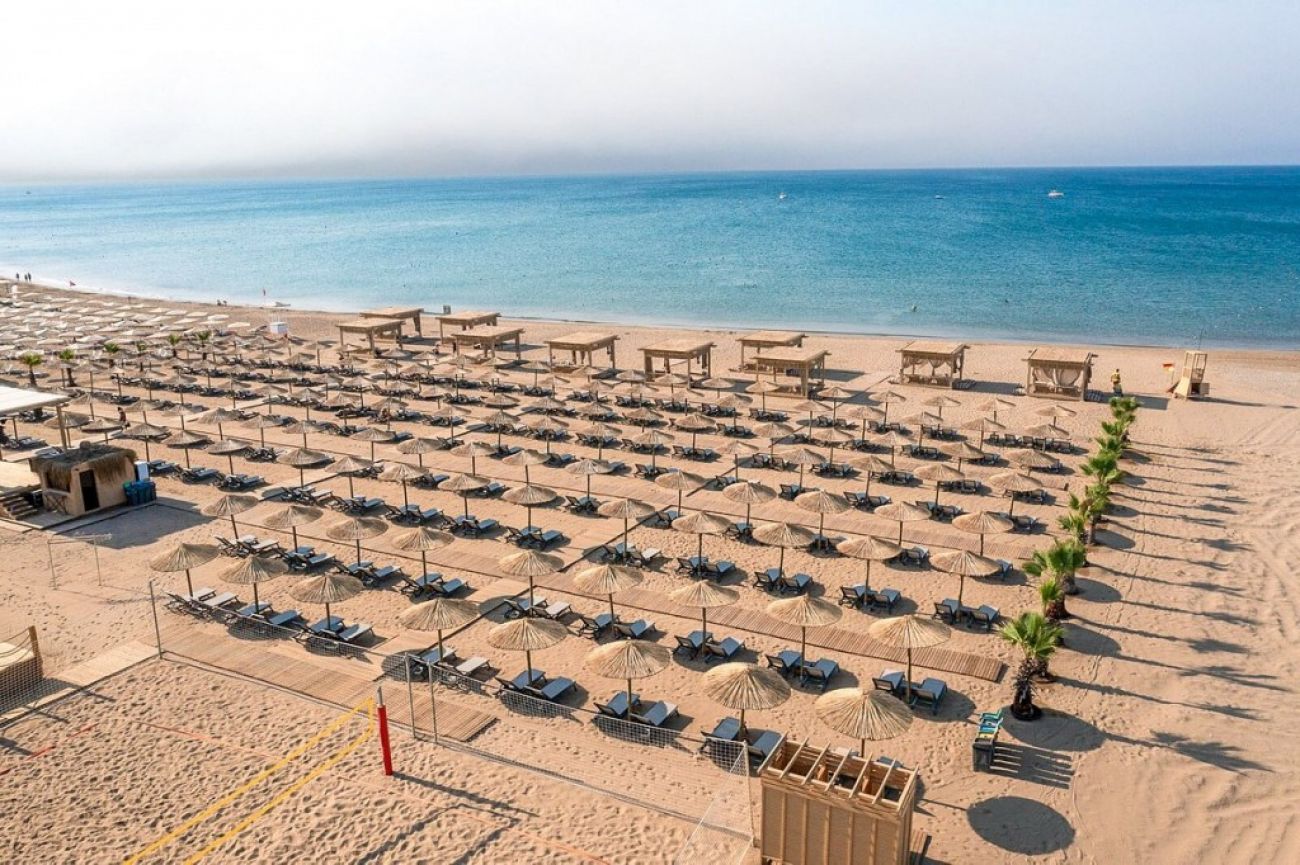 Собствен, пясъчен, на 250 м от основната сграда на хотела. Осигурен е безплатен шатъл транспорт за гостите. Чадъри, шезлонги и плажни кърпи на плажа и при басейна - безплатно.