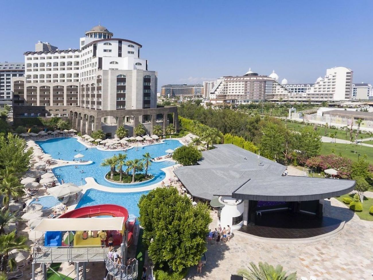 Основен ресторант (вегетарианска храна), 3 ресторанта a la carte (турски, рибен и международна кухня, с предварително записване за едноседмичен престой посещението на един от ресторантите е безплатно), 4 бара (един от тях работи 24 часа), дискотека, сладкарница, открит басейн с детска секция, закрит басейн (с подгряване през април и октомври), 3 водни пързалки, детски клуб, лекарски кабинет , SPA-център, фризьорски салон, търговски кът, пералня, конферентна зала.