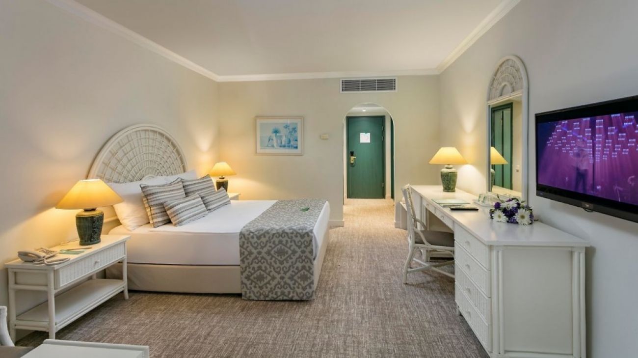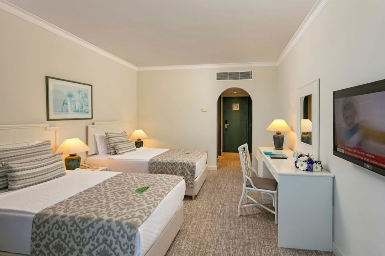 В стаите: Хотелът разполага с общо 598 стаи, разположени в две пет-етажни сгради. Всички стаи са оборудвани с климатик, телевизор, телефон, баня с душ/вана, сешоар, минибар (всекидневно зареждане с вода, безалкохолни напитки, бира), сейф. Почистване на стаите и смяна на кърпите - всеки ден, смяна на спалното бельо - 3 пъти седмично.