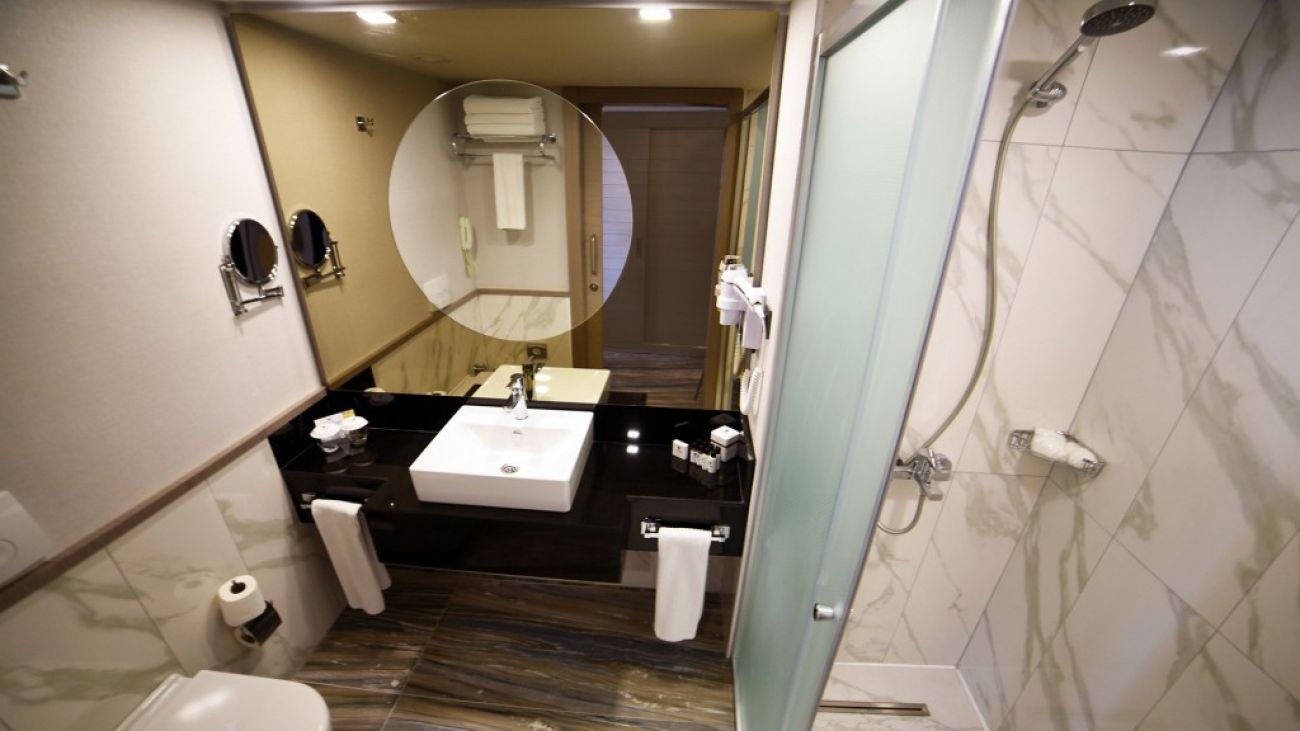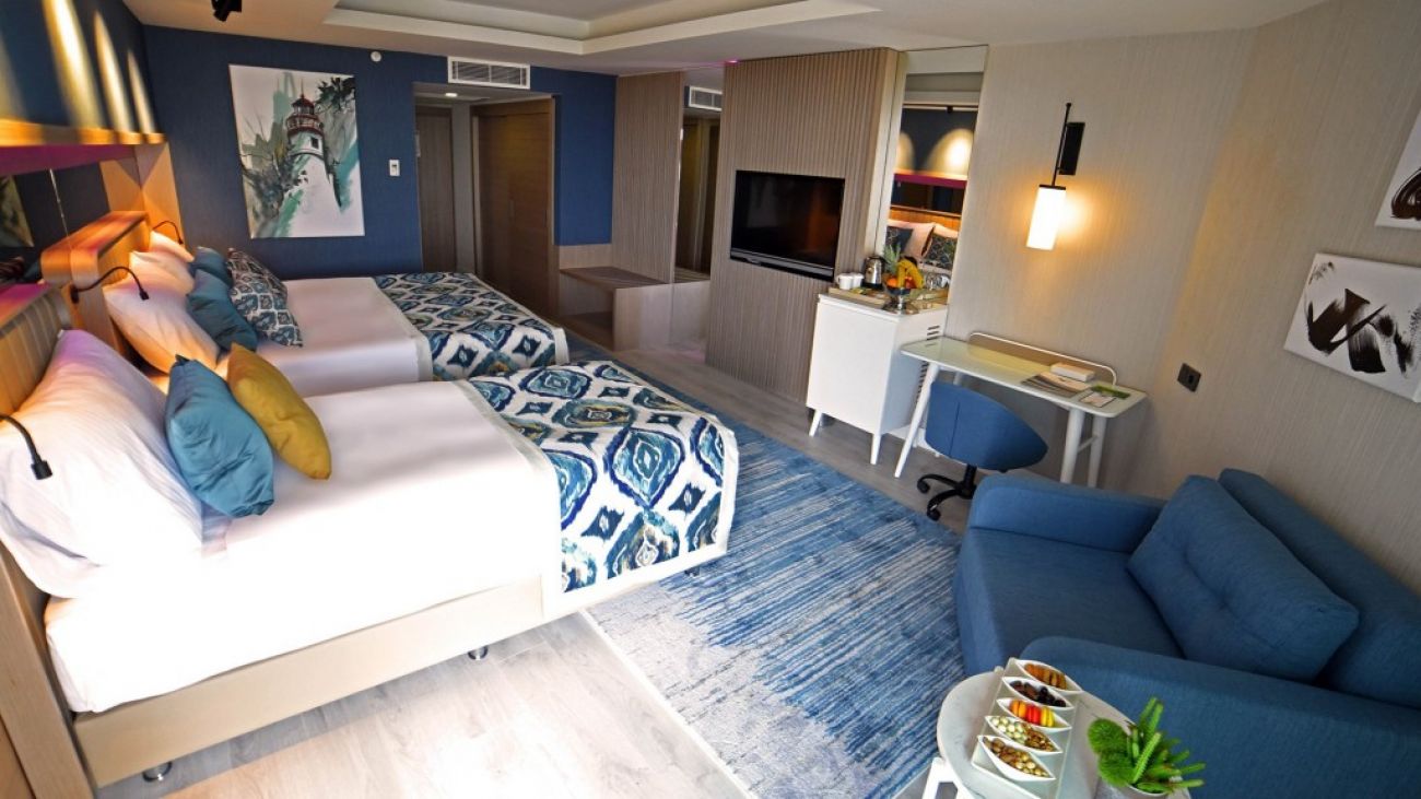 В стаите: Хотелът разполага с общо 457 стаи. Стаите разполагат с централна климатизация (отворена в определени часове, в зависимост от метеорологичните условия), мини-бар (вода, безалкохолни напитки и бира - презарежда се ежедневно), сателитна телевизия, телефон с директно избиране, баня с душ, сешоар, сейф, халати (такса), чехли (безплатно), кана, комплект за чай и кафе, меню за възглавници (срещу заплащане), мека мебел, бюро, балкон, WI-FI, под - ламинат. Почистване на стаите - ежедневно, смяна на спално бельо - 3 пъти седмично.