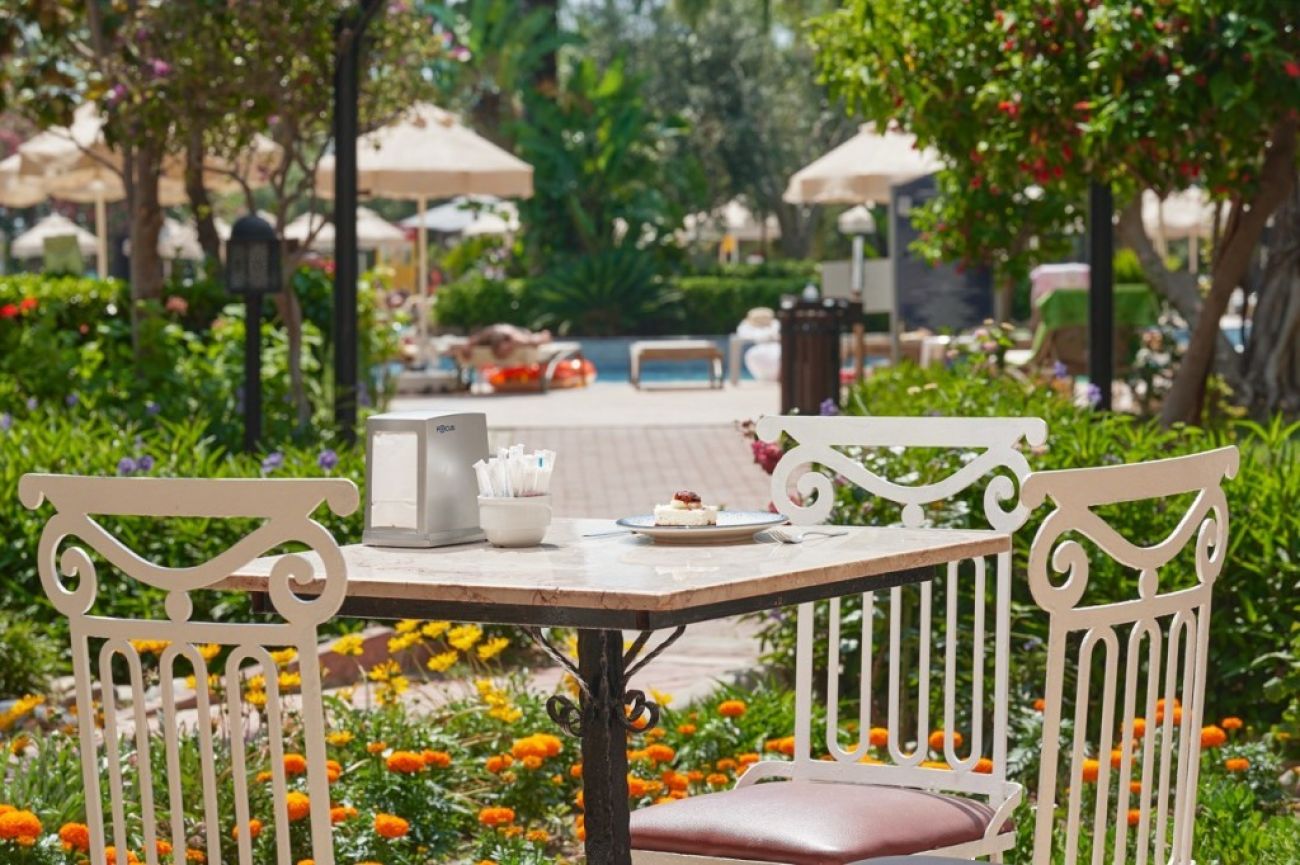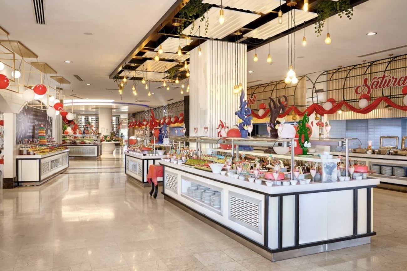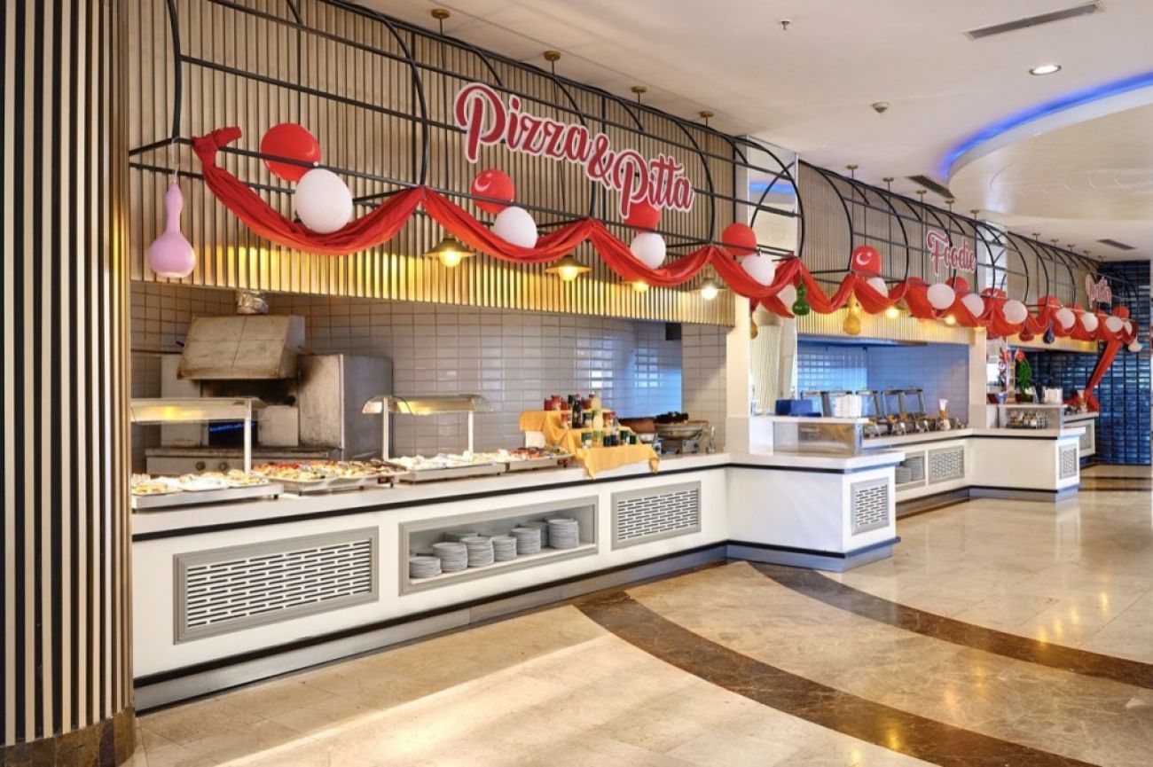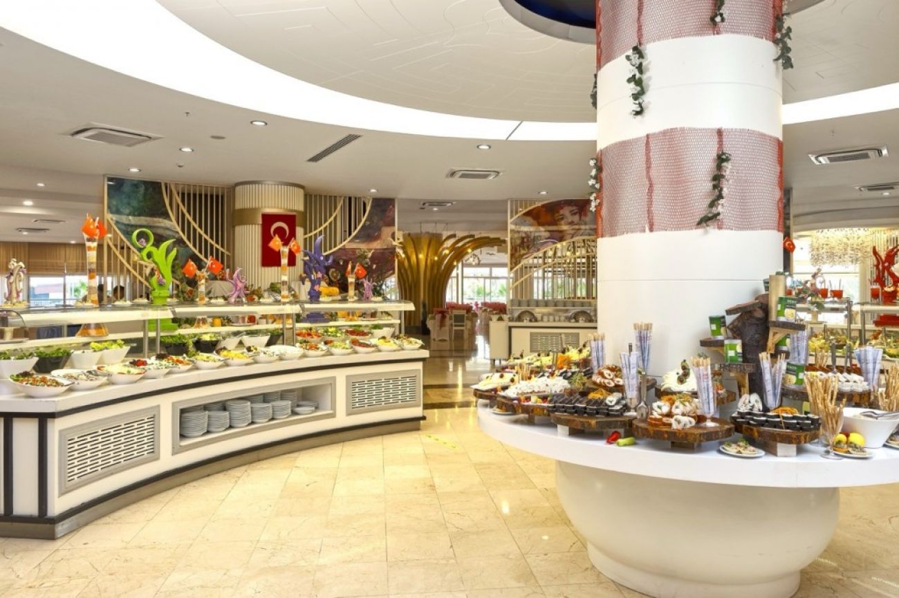 На територията на хотела: Myra Restaurant- предлага храна и напитки през по-голямата част на денонощието- интернационална и турска кухня. Topkapı A La Carte Restaurant- изискана турска кухня, Dharma- азиатска кухня, Ristorante Eleganza- италиански ресторант, (всички а ла карт ресторанти предлагат безплатен обяд или вечеря, с всички резервации за 7 нощувки.) Няколко бара, някои от тях сервират коктейли и са отворени почти 24 часа, нощен бар с анимация. Лоби бар Coral Bar, White Night Bar и Pool Bar отворени от 10ч до 00ч; Beach Bar- от 10 до 18ч; Disco Bar от 00ч- до 02ч и Street Bar 24/7, предлага национални алкохолни както и някои интернационални. Side Bar- от 16ч до 00ч, Snack Bar- от 12.30ч-15ч. Безплатно WiFi.