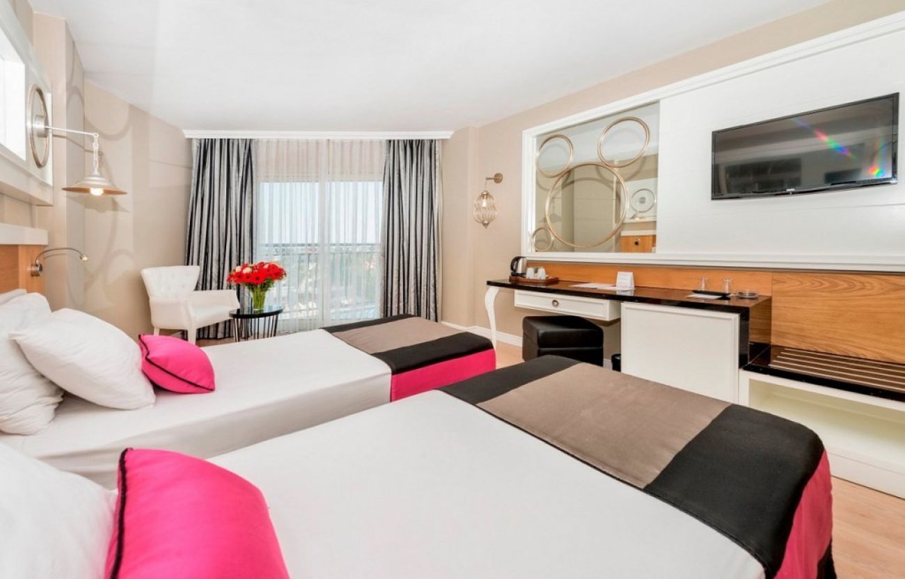 В стаите: Хотелът разполага с 416 стаи. Всички стаи са оборудвани с: климатик, телефон, телевизор, баня с душ, сешоар, мини бар(безплатно само при настаняване), сейф, балкон. Почистване на стаите - всеки ден. Standard room (25 m²), Family room (32 m²), Duplex room (45 m²)