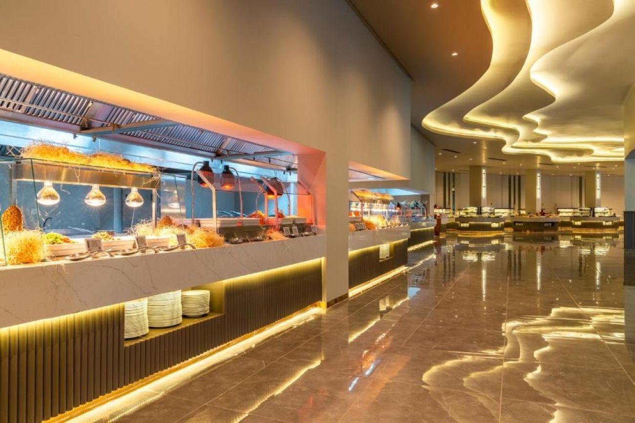 На територията на хотела: Основен ресторант – с детски бюфет и диетична кухня, 24 часов ресторант с бар – „Gusto“ с а ла карт меню – без резервация, 3 а ла карт ресторанта - италиански, турски и рибен (с предварителна резервация и веднъж безплатно използване на един от тях за седмичен престой), сладкарница, два снек ресторанта, 5 бара, дискотека, открит и закрит басейн, басейн с пързалки за възрастни, СПА център, магазини, паркинг.