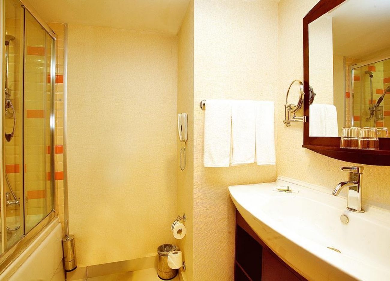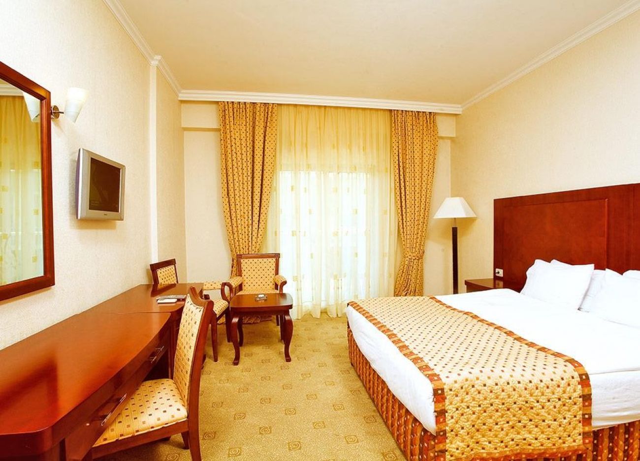 В стаите: Хотелът се състои от 295 стаи. Всички стаи са оборудвани с: баня с душ, сешоар, централен климатик, TV , телефон, сейф (срещу доп. заплащане), мини бар (празен), килим, балкон. Почистване на стаите - всеки ден, смяна на спално бельо - 2 пъти седмично.