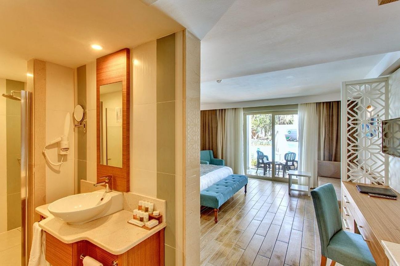 Deluxe Room - 30 м2, двойно или две единични легла, диван, баня с душ, балкон, гледка към басейна.