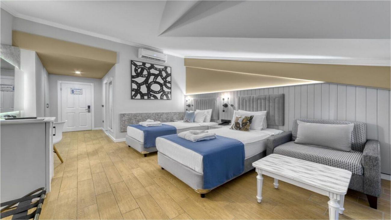Seven Seas Palmeras Bay разполага с различни видове стаи — от стандартни двойни до супериорни и фамилни помещения. Всички стаи са оборудвани с удобства като климатик, телевизор, минибар, сейф, безплатен Wi‑Fi и балкон или тераса. Семейните стаи предлагат повече пространство и удобства за комфортен престой на по‑големи групи гости.