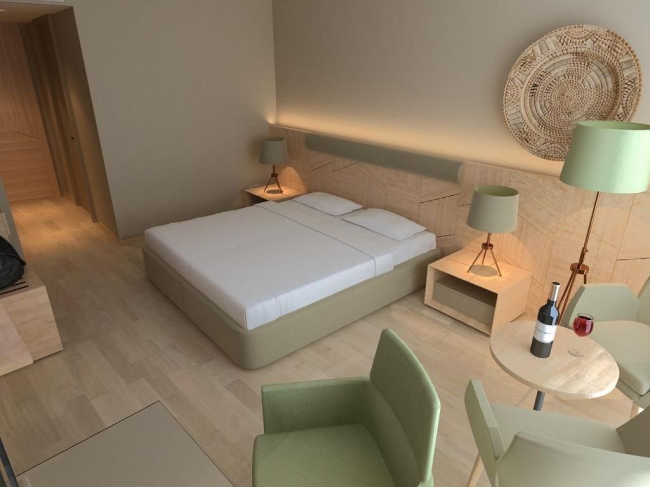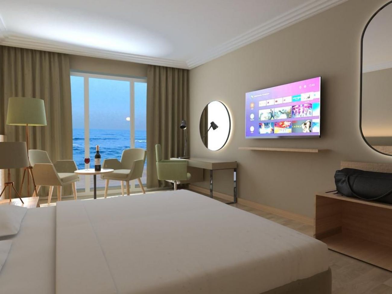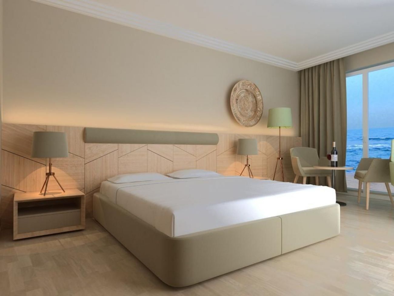 Хотелът разполага с общо 250 стаи, от които 66 стандартни стаи с изглед градина (20-30 m²), 138 стандартни стаи с изглед море (20-30 m²), 7 промо стаи (20-30 m²), 10 джуниор суита (спалня и всекидневна, 60 m²) и 29 фамилни суита (2 спални, 2 бани, 60 m²), разположени в основна сграда. Всички стаи са оборудвани с климатик, телефон, телевизор, баня с душ, сешоар, сет за кафе/чай, мини бар ( eжедневно зареждане с вода и безалкохолни напитки), сейф (безплатно), Wi-Fi, балкон в някои от стаите. Почистване на стаите - всеки ден, смяна на спалното бельо - 2 пъти в седмицата.