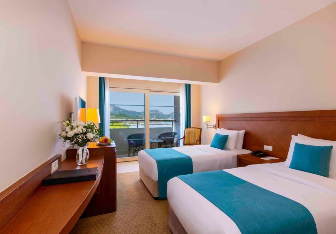Standard Double Room Sea View - 26-32 m², с изглед към морето. Стандартните двойни стаи се намират в основната сграда, с едно двойно легло или две отделни легла и място за едно допълнително легло , в повечето от този тип стаи е разтегателен диван. Всички стаи разполагат с баня с душ и балкон.