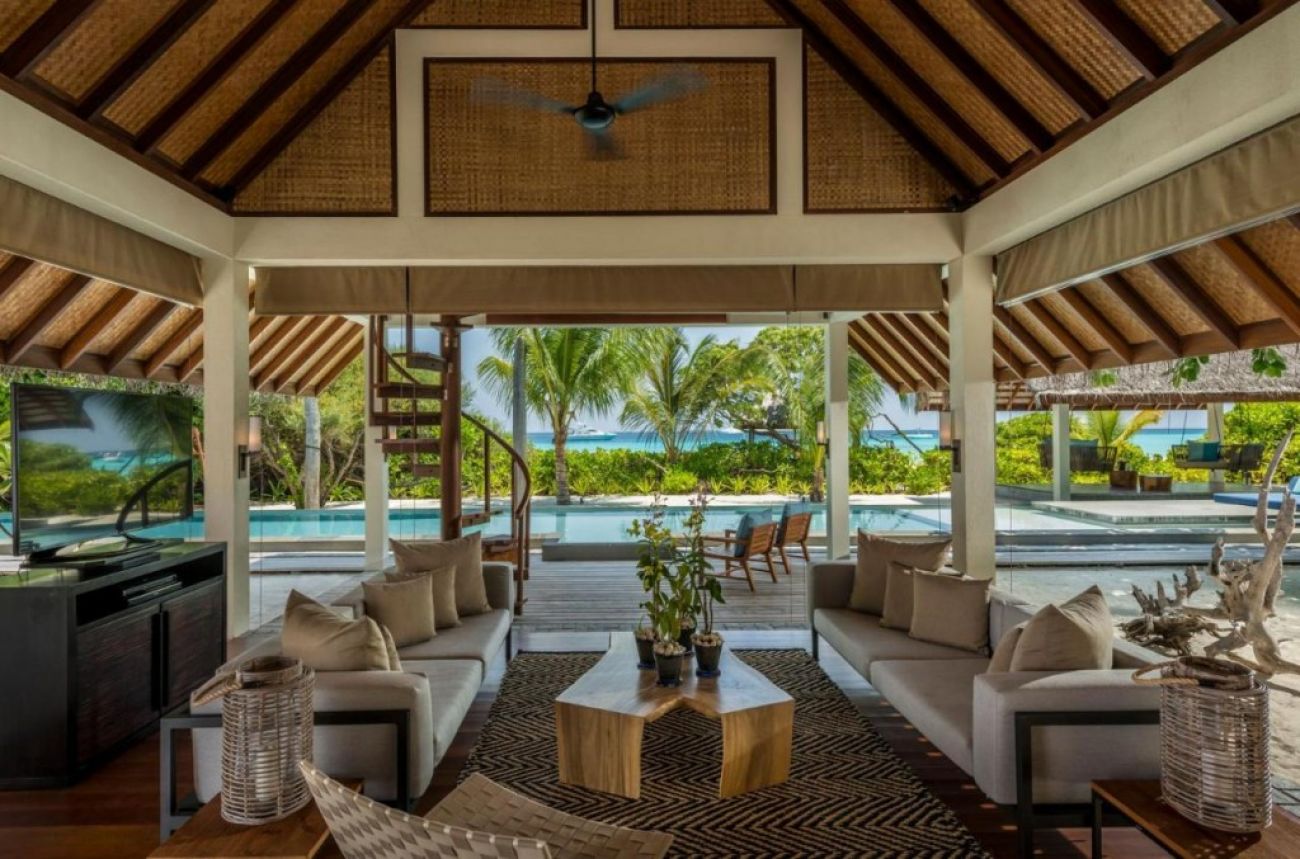 Триспален суит над водата (294 м² + 397 м² външно пространство) с две легла king и две единични легла, за до 6 гости, включително до 5 деца.