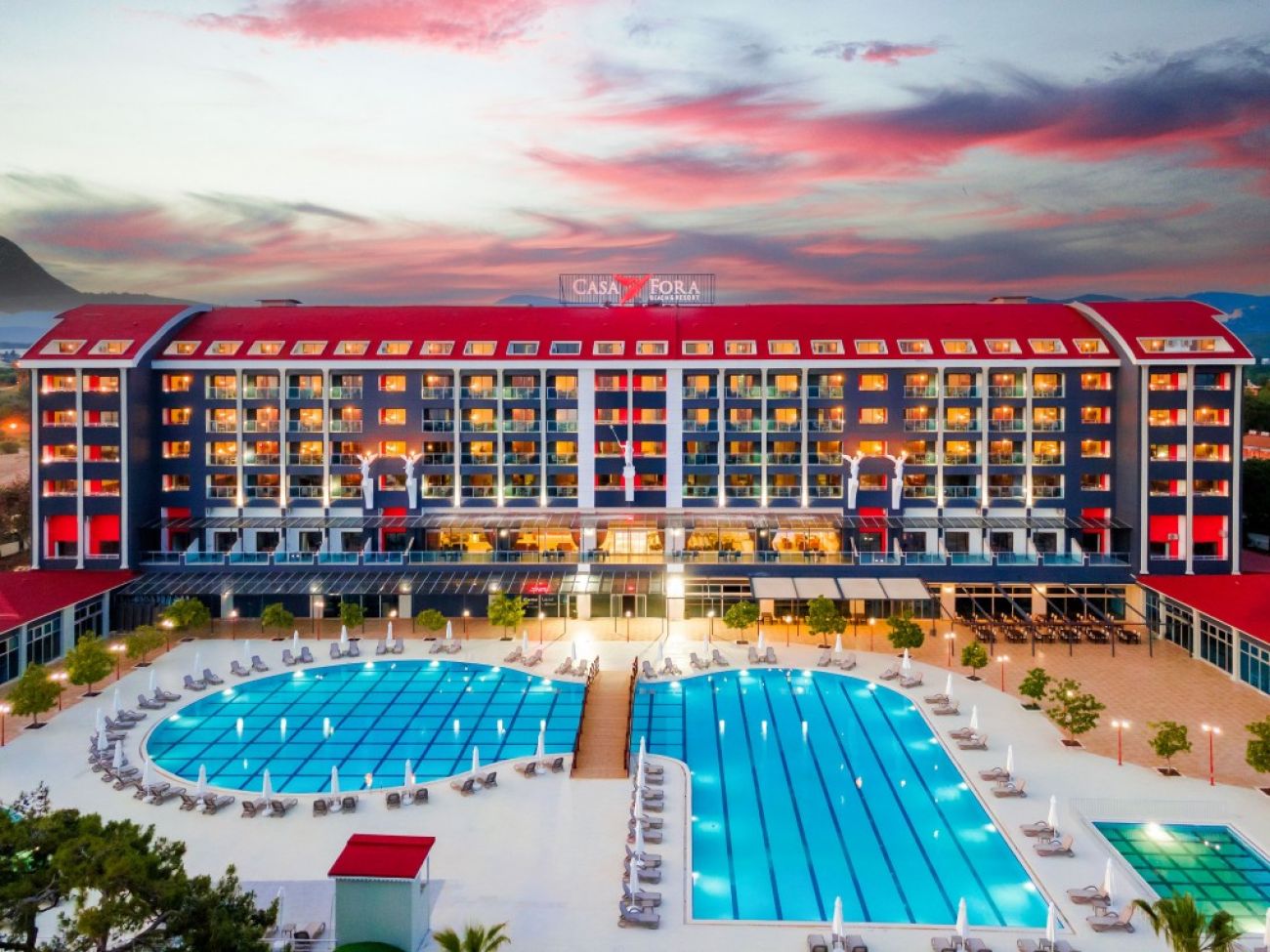 На територията на хотела: открит и закрит басейн, основен ресторант, 3 а ла карт ресторанта (средиземноморски, турски и рибен, с предварително резервация и еднократно използване на един за седмичен престой), 3 бара, фитнес зала, СПА център, безжичен интернет WiFi.